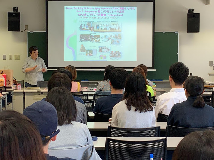 「国際理解論」の内容の一部は日本の高齢化・少子化・出産と子育てに関する日本およびグローバルな視点を含みます。毎年、旭川いのちを考える懇談会の代表の一人が授業内でミニ講話を行っています。